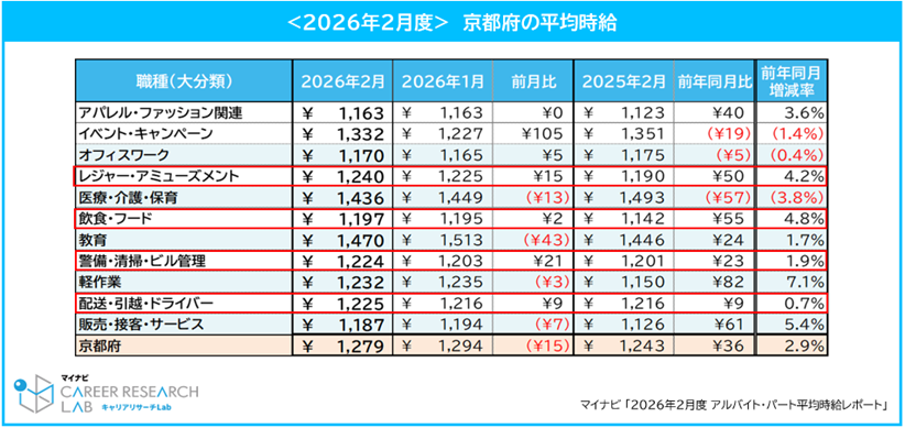 ◆【今月のTOPIC】2026年3月に宿泊税が引き上げられた「京都府」に注目。京都の平均時給は、1,279円で前年同月から36円増
