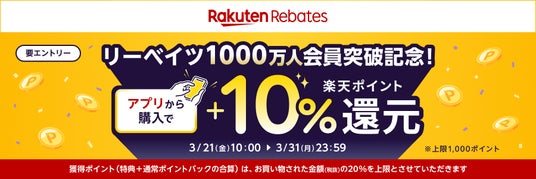 楽天グループ株式会社(以下「楽天」)が運営するオンライン・ポイントバックサイト「楽天リーベイツ(Rebates)」は、サービスの利用登録者数が1,000万人を突破したことを記念し、「楽天リーベイツ(Rebates)」公式アプリを通じたお買い物で「楽天ポイント」の還元率が通常より+10%になるキャンペーン「1,000万人会員突破記念キャンペーン」(以下「本キャンペーン」)を、2025年3月21日(金)から3月31日(月)まで開催します(注)。