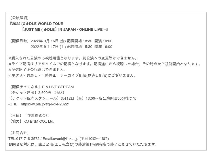 韓国出身のグローバルガールズグループ (G)I-DLEが、 9月 16日(金)・17日(土)に、東京・豊洲PITにて行う「2022 (G)I-DLE WORLD TOUR [JUST ME ( )I-DLE]IN JAPAN」が、オンライン配信動画サービスPIA LIVE STREAMにて生配信されることになった。