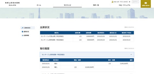 お客さまごとの現在の出資状況や、過去の取引(購入、贈与等)の履歴をセレサージュサロン上で閲覧することができるようになり、オンライン上でいつでも資産状況の確認が可能となります。