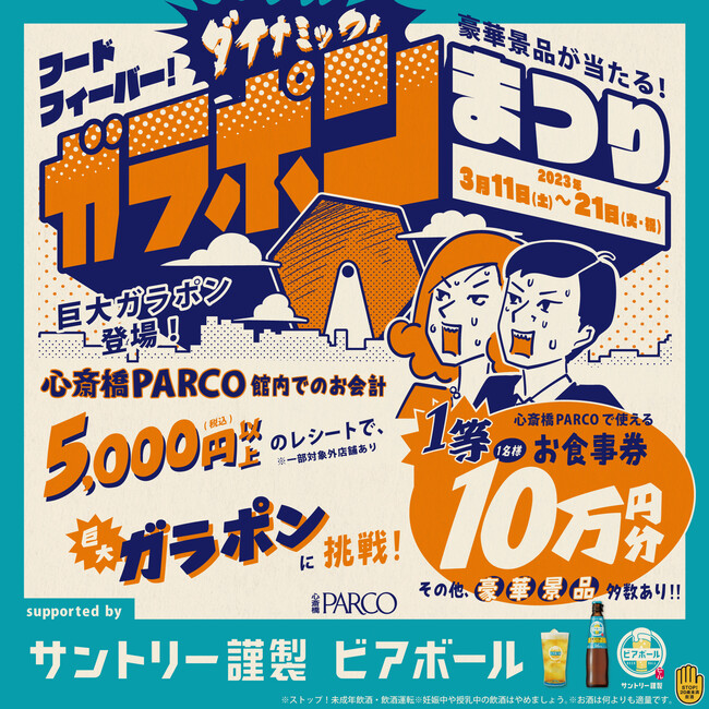 ■内容:心斎橋PARCO館内にて当日5,000円以上お買上げのレシート(合算可)で巨大ガラポンにチャレンジ!