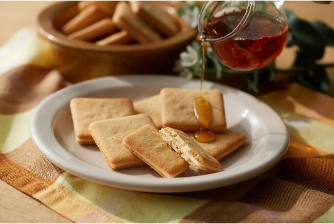 メープルシュガーを生地に練りこみ、サクサクと軽い食感に焼いたクッキーでバター風味のチョコをサンド。