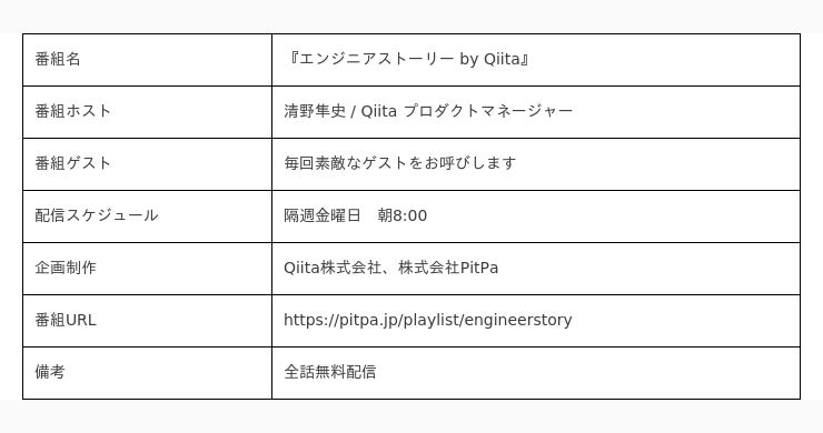 『エンジニアストーリー by Qiita』は、近年高まるエンジニア向けPodcastのニーズに応え、Podcast制作会社であるPitPa社と連携しながら、エンジニアのキャリア形成に有益な情報を発信してまいります。
