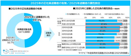 2025年に退職者が発生した企業は49.3%となり、退職者の属性別では「中途入社の正社員」が87.8%で新卒社員の正社員よりも多く、年代別では「20代の正社員(82.7%)」、勤続年数別では「勤続5年以上の中堅社員(81.9%)」が高い結果となった。