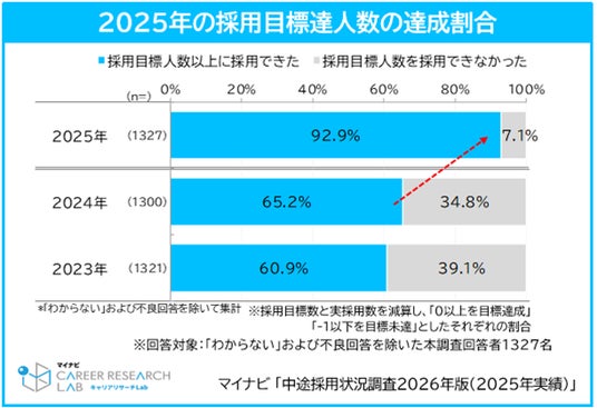 2025年に採用人数の目標を達成した企業は92.9%となり、2024年(65.2%)から27.7pt増と大きく向上した。2023年(60.9%)と比べても、目標達成率の向上は顕著といえる。