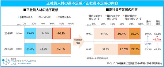 2025年の中途採用は、目標以上の人数を採用できた企業の割合が前年から大きく向上しました。しかし、この背景には採用目標人数の下方修正を伴う採用計画の見直しが影響している可能性がみられました。また、正社員人材の不足感は前年より減少したものの4割超と依然として高く、不足感の内容は「量的な不足」から「質的な不足」にシフトしつつある様子がうかがえます。