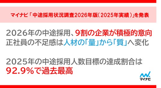 株式会社マイナビ(本社:東京都千代田区、代表取締役 社長執行役員:粟井俊介)は、中途採用業務を担当する企業の人事担当者1,500名に実施した、「中途採用状況調査2026年版(2025年実績)」の結果を発表しました。