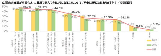 ●緊急避妊薬の薬局販売にあたって女性が感じる不安のトップは、「緊急避妊薬さえあれば避妊しなくても大丈夫といった誤解が広がり、通常の避妊をおろそかにしてもよいとの風潮になること」(48.3%)