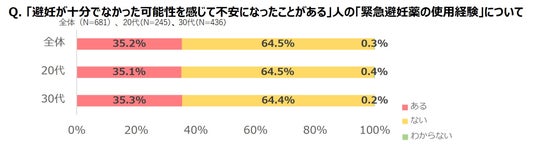 「避妊が十分でなかった可能性を感じて不安になったことがある」と回答した女性のうち、「緊急避妊薬を使用したことがない」人が64.5%と、「使用したことがある(35.2%)を大きく上回る結果に。