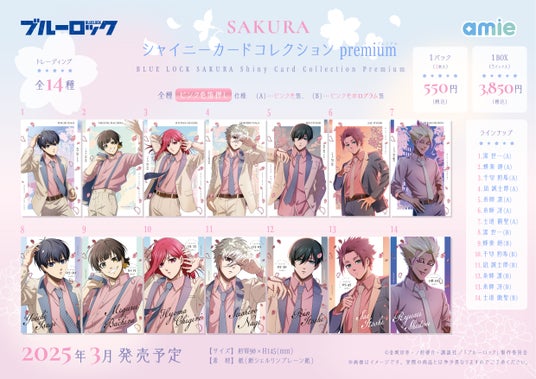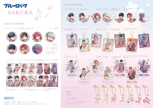 フィギュア&ホビー通販大手の「あみあみ」を運営する大網株式会社(本社・東京都文京区)は、自社が展開するグッズブランド「amie(アミィ)」から、TVアニメ『ブルーロック』の「桜」×「時間」がテーマの描きおろし商品「SAKURA」シリーズとして「トレーディング箔押し缶バッジ」「ぴくりあプレート hologram」「シャイニーカードコレクション premium」「Sparkle*チェーンアクリル」「アクリルスタンド」「イメージチャーム」を発売いたします。