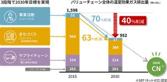 気候変動の緩和では、2050年までに温室効果ガス(以下、GHG)の排出量をネットゼロにするカーボンニュートラルの実現を目指しています。GHG排出量を2030年までに40%削減(2015年度比)することを掲げ、「事業活動」や「まちづくり」、「サプライチェーン」の3段階で取り組みを進めています。