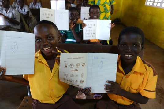 今回、日本とガーナ共和国の小・中学校で、子どもたちの生活やカカオなどについて授業を行ってきました。ガーナ共和国の授業では、「自分たちが作っているカカオはどう使われているのか」「そのカカオから作られたチョコレートを食べている日本はどんな国か」を、紙芝居や寄贈した「ReCacao Note」を使いながら伝えました。さらに日本の子どもたちから募ったガーナの子どもたちへの質問(下記参照)を投げかけ、遠く離れた同世代が感じた疑問に答えてもらいました。みんな目をきらきらと輝かせながら授業を受けており、日本のことについて手を挙げて積極的に質問もしてくれました。