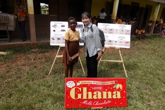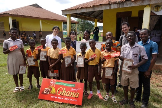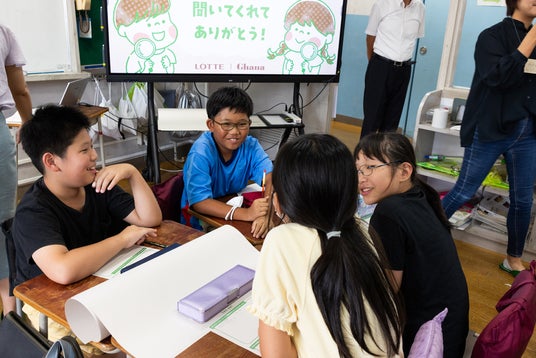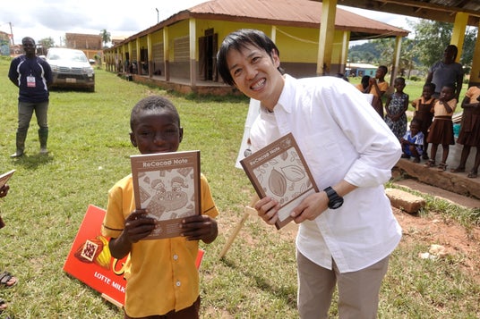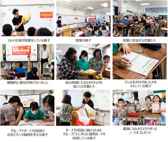 株式会社ロッテ(本社:東京都新宿区、代表取締役社長執行役員:中島英樹、以下ロッテ)は、2023年9月に立ち上げたガーナチョコレートの社会貢献の一つである「A Happy Cycle with Ghana」において「ReCacao Note PROJECT」を実施いたしました。2024年10月にロッテ社員がガーナ共和国の小・中学校に赴き、日本ロッテからは”カカオハスク”をアップサイクルしたノート(ReCacao Note)、韓国ロッテからはペンケースを寄贈いたしました。昨年訪問した際に、教材不足について学校職員より意見をいただき、ノートとペンケースの配布に至りました。また、今回日本とガーナ共和国それぞれの小・中学校で実施した授業を通じて、両国の子どもたちの探求心を培う活動を展開しました。