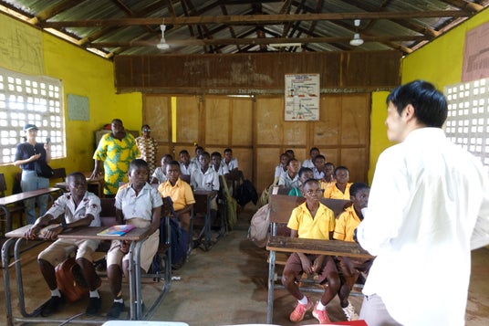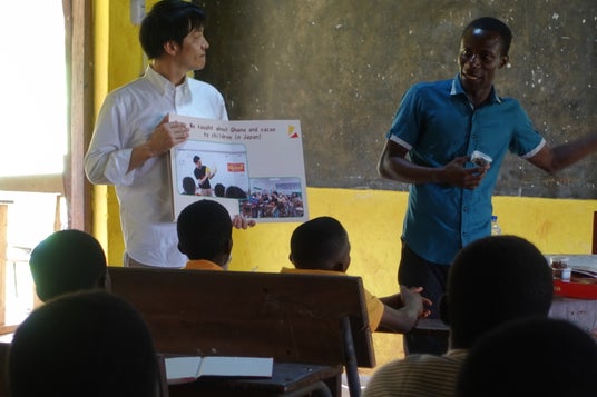 また、現地で話を聞いていく中で、ガーナ共和国の子どもたちの中には世界地図を見たことがなく、自国の場所や他国のことを知らない子どもが多くいるという話も伺いました。ノートを寄贈するだけではなく、私たちにできることは何かを考えていく中で、子どもたちが世界を知るきっかけに何かおこなうことができないかと思い、子どもたちに向けて授業を行うことにしました。