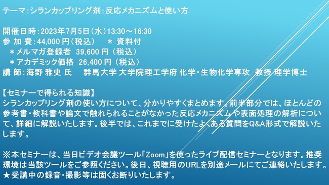 先端技術情報や市場情報を提供している(株)シーエムシー・リサーチ(千代田区神田錦町: https://cmcre.com/ )では、 各種材料・化学品などの市場動向・技術動向のセミナーや書籍発行を行っておりますが、 このたび「シランカップリング剤:反応メカニズムと使い方」と題するセミナーを、 講師に海野 雅史 氏 (群馬大学 大学院理工学府 化学・生物化学専攻 教授 理学博士)をお迎えし、2023年7月5日(水)13:30より、 ZOOMを利用したライブ配信で開催いたします。 受講料は、 一般:44,000円(税込)、 弊社メルマガ会員:39,600円(税込)、 アカデミック価格は26,400円(税込)となっております(資料付)。