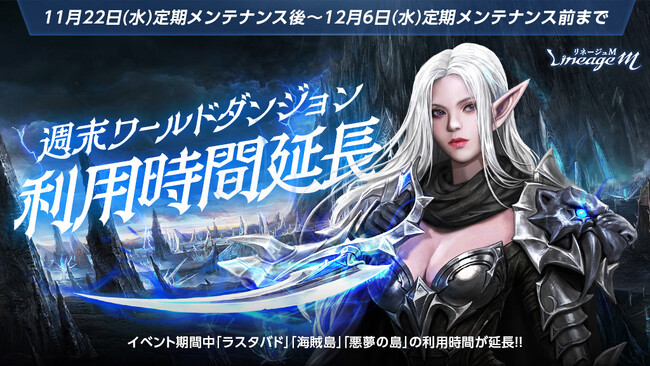 週末ワールドダンジョンの「ラスタバド」、「悪夢の島」、「海賊島」の利用時間が通常の4時間から6時間に利用時間が延長します。