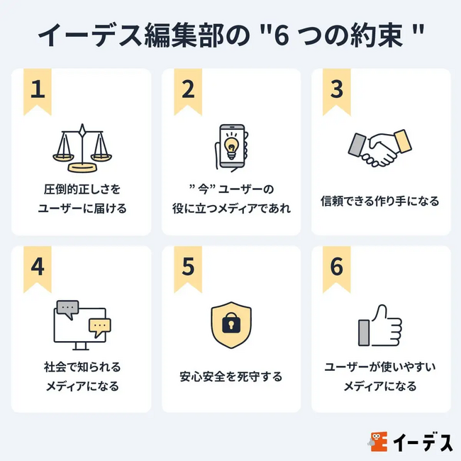 「イーデス」では、暮らしに関する「まよい」を「よかった」にするために、”絶対的な信頼を獲得する”ことを目的として「ビジョンプロジェクト」を始動し、6つの行動指針のもと、信頼性のある記事の公開・サービスの運営に努めてまいりました。