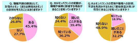 一方で、「睡眠不調の原因としてホルモンの影響を考えたことがある人」は45%にとどまり、さらに、「睡眠への影響や体調変化を把握する手段として基礎体温計測が有効であることを知っている人」はわずか19%という結果に。 多くの女性がホルモン変動による睡眠への影響を実感している一方で、その背景の理解や具体的なセルフケア手段の認知は十分とはいえない現状が明らかになりました。