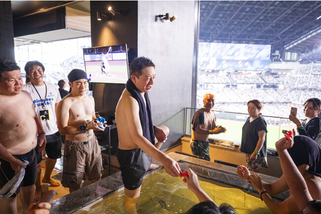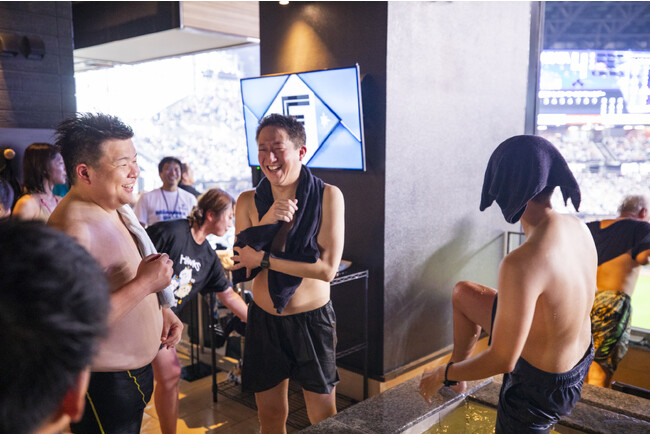 他にも「ホームラン予想!当たったら全員にドリンク1杯プレゼント」では、ファンと一緒に誰がホームランを打つか予想。「清宮、万波のいずれか」というヨミは見事的中。1回裏に清宮選手がライトスタンドにアーチを描くとサウナと温泉を楽しんでいた全員が水着姿で大盛り上がり。他にも「イニングカメラに写ろう」「ファイターズ〇×クイズ大会」といったイベントも順次開催。イベント終了後には隣接しているバースペースで記念撮影のサービスも行われました。