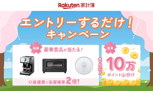 Androidアプリの提供開始を記念して、「【エントリーするだけ!】10万ポイント山分け&抽選で豪華賞品が当たる新生活応援キャンペーン」を、本日から5月31日(土)まで開催します。期間内に本キャンペーンページ内に記載された特典の中より希望する特典を選択し、エントリーを行った「楽天家計簿」ユーザーが、進呈の対象となります。