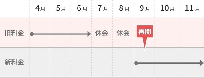 ●経過措置期間に休会および再開のお客様は、再開時から新料金が適用されます。