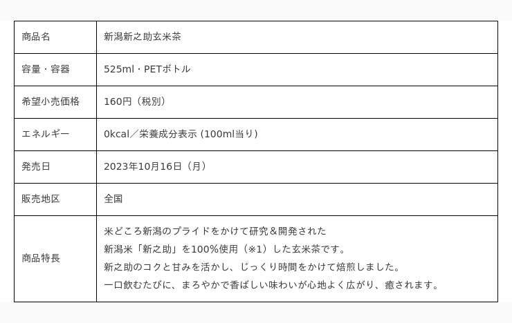 今回発売する「新潟新之助玄米茶」は、新潟県産の「新之助」を100%使用した(※1)玄米茶です。玄米茶は「香ばしさ」を求めて飲用される方が多く、ご家庭でリーフタイプを飲まれることが多いお茶です。外出先でも手軽に香ばしい味わいと香りの玄米茶を楽しんでいただくための素材を探す中で、ロースト感が強く、玄米茶にしても美味しいお米として、新潟県産の「新之助」に着目しました。「新之助」は、2017年に一般販売を開始した新潟の新たなブランド米で、コクと豊潤な甘みが特長のお米です。この特長を活かすため、低い温度で長い時間をかけて行う熱風焙煎を採用し、抽出温度などにもこだわることで、香ばしさはもちろんのこと、お米の味わいも楽しめる玄米茶が完成しました。低カフェイン(※2)なので、リラックスシーンにもおすすめの商品です。