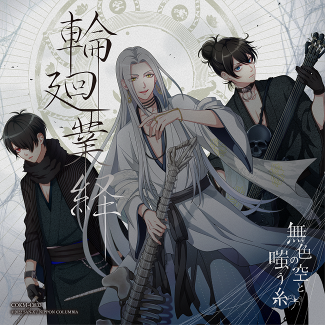 “蜘蛛の糸”をモチーフにしたユニット「無色の空と嗤う糸」は、ノノ(CV:橋本晃太朗)、カン(CV:沢城千春)、クモオ(CV:山下誠一郎)の3人からなるユニット。新曲「輪廻業経」は、これまでボーカルを務めていたノノ(CV:橋本晃太朗)に加えて、カン(CV:沢城千春)、クモオ(CV:山下誠一郎)も譜声を披露するユニット初の全員歌唱曲。