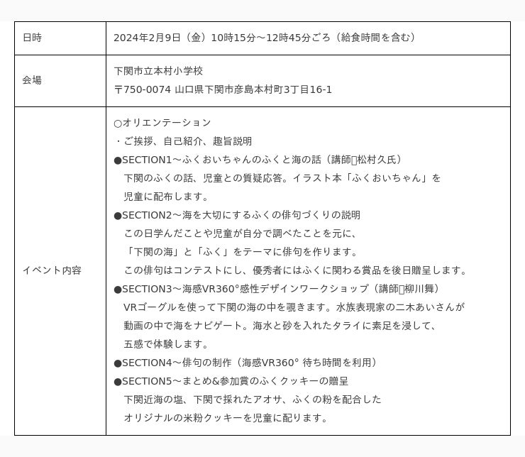 このイベントは下関市が毎年行う「ふくの日」の「ふく汁給食」とコラボレーションし、知る、学ぶ、触る、作る、食べる、という感性の部分で子どもたちの記憶に残る「海の学び」の総合学習の機会を提供します。また、当日は下関市前田市長も来賓され、児童と一緒に給食を召し上がる予定です。