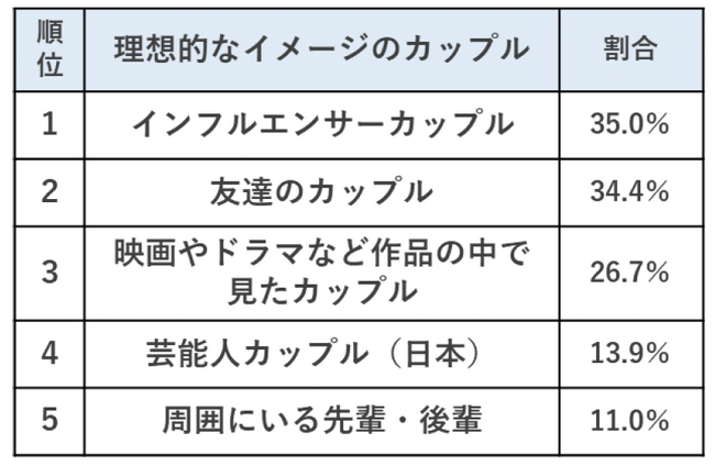 「こんな恋愛がしたい」「こんな恋人関係が築きたい」といった理想の恋愛・恋人関係のカップルはいますか?と聞くと、YESが48.9%、NOが51.1%と半々になる結果に。YESと回答した人に、その理想のイメージのカップルは誰かと聞くと、1位にインフルエンサーカップルがランクイン。手の届かない“憧れ”よりも、自分たちにとってどこか“等身大”で身近に感じられる姿に共感できる人であることが重要なようです。