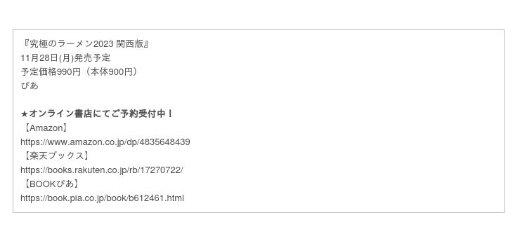 毎年9月に発刊されてきた「究極のラーメン 関西版」(ぴあ)が、今年は11月末に発売されることが決定した。