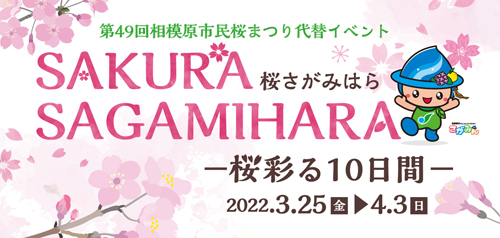 相模原市民桜まつりは、1974年に市制施行20周年を記念して相模原のふるさとづくりをテーマに始められた市民まつりです。今回、4月2日(土)・3日(日)の開催が予定されていましたが、新型コロナウイルス感染症の状況が考慮され、代替イベント「SAKURA SAGAMIHARA-桜彩る10日間-」が開催されることとなりました。なお、本イベントでは、(1)市役所さくら通りライトアップ (2)最新技術を駆使した桜映像の配信 (3)桜名所スタンプラリー「さがみんからの指令」 (4)Air de 市民桜まつり2022 が予定されております。