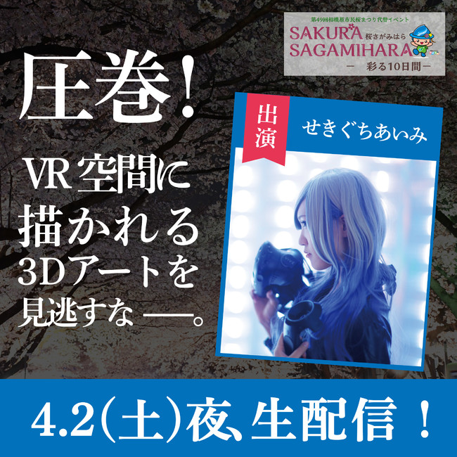 相模原出身のVRアーティスト“せきぐちあいみ”が、VR空間に「桜×相模原×未来」をテーマにした3Dアートを描く様子を配信します。そのほか、トークショーも予定!圧巻のライブパフォーマンスをお見逃しなく!!