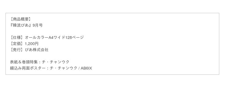 『韓流ぴあ』+AB6IX 2L判生写真(1枚)+ポストカード 定価:1,200円(本体1,091円+税)