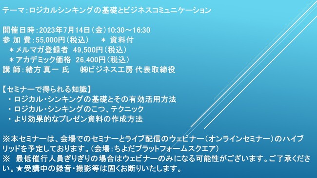 先端技術情報や市場情報を提供している(株)シーエムシー・リサーチ(千代田区神田錦町: https://cmcre.com/ )では、 各種材料・化学品などの市場動向・技術動向のセミナーや書籍発行を行っておりますが、 このたび「ロジカルシンキングの基礎とビジネスコミュニケーション」と題するセミナーを、 講師に緒方 真一 氏 ((株)ビジネス工房 代表取締役)をお迎えし、2023年7月14日(金)10:30より、会場(ちよだプラットフォームスクウェア)とZOOM配信でのハイブリッド開催にて予定いたしております。 受講料は、 一般:55,000円(税込)、 弊社メルマガ会員:49,500円(税込)、 アカデミック価格は26,400円(税込)となっております(資料付)。