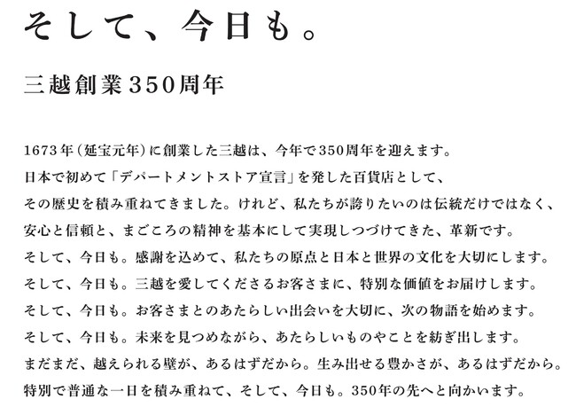 三越創業350周年にあたり、これまで永きに渡り、ご支援を賜りましたお客さま、お取組先さま、地域の皆さまをはじめ、すべてのステークホルダーの皆さまに厚く御礼申しあげます。ここに350周年を迎えられますことは、我々従業員一同の誇りであり、同時にその責任の重さに身が引き締まる思いです。