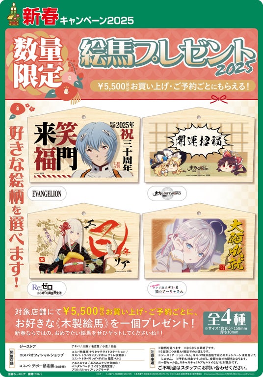 2. 「あみあみ秋葉原ラジオ会館店」他、対象店舗にて¥5,500(税込)お買い上げ・ご予約ごとに、お好きな「限定木製絵馬(全4種)」を1個プレゼント。