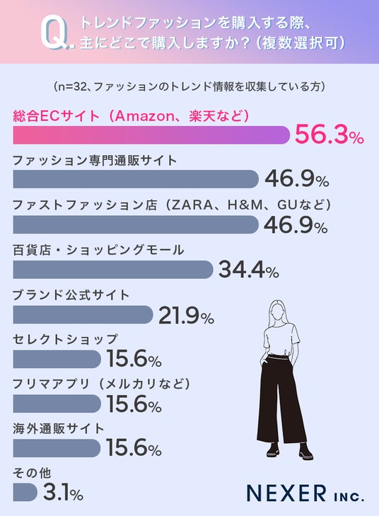 最も多かったのは「総合ECサイト(Amazon、楽天など)」で56.3%でした。次いで「ファッション専門通販サイト」と「ファストファッション店(ZARA、H&M、GUなど)」が同率の46.9%で並びました。