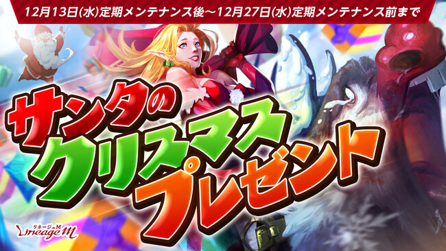 PCオンラインRPG「リネージュ」のモバイル版タイトル『Lineage M(以下、リネージュM)』のサービス、運営をしているエヌ・シー・ジャパン株式会社(東京都港区、代表取締役:金 澤憲(キム テクホン) 以下、エヌシージャパン)は、2023年12月13日(水)に、クリスマスイベント「サンタのクリスマスプレゼント」、および「黒ウサギの祝福と大騒動」の開催をお知らせします。