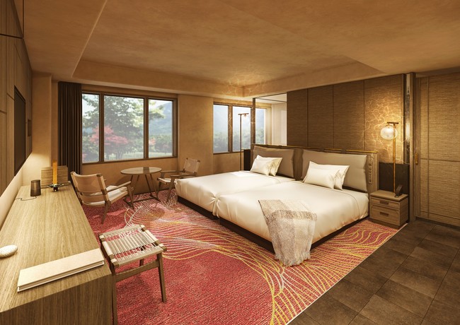 客室では、落ち着いた空間の中にもこだわりのデザインとアイテムでお客様をお迎えします。ホテルが位置する“白川”の地が京都における水の代名詞であることを背景に、水の流れや輝きを感じさせる演出照明や水の流れをデザインしたカーペットを配するほか、ホスピタリティアイテムとして全室に「茶箱」を設え、滞在中は客室内のみならず中庭でも京文化の1つであるお茶をお楽しみいただけます。