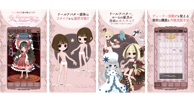『My Marionette Atelier』とは、スマートフォンの中でも自分だけのドールのコーディネートを楽しみ、自慢のドールを仲間と見せ合えるドールファンのためのアプリです。