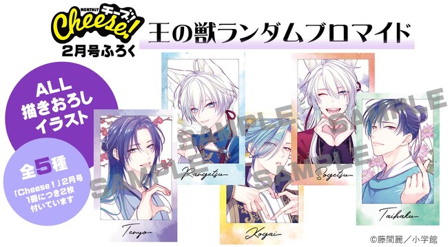 本日[2023年12月22日]発売の月刊「Cheese!」2月号は、そんな超美麗な『王の獣』の描きおろしイラストを使ったランダムブロマイドがふろく。全5種類のデザインのうち、1冊につき2枚がランダムで付いています。隣国との戦乱というシリアスな本編とは雰囲気の異なる、キュートな表情とポーズには必見!