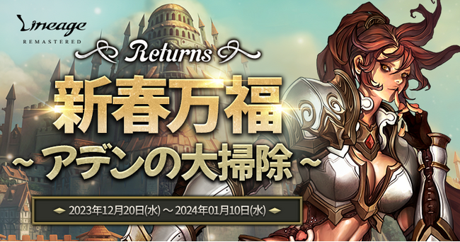 PC向けオンラインゲーム『リネージュ』をサービス、運営しているエヌ・シー・ジャパン株式会社(東京都港区、代表取締役:金 澤憲(キム テクホン))は、2023年12月20日(水)にイベント「新春万福~アデンの大掃除~ リターンズ」の開催をお知らせします。