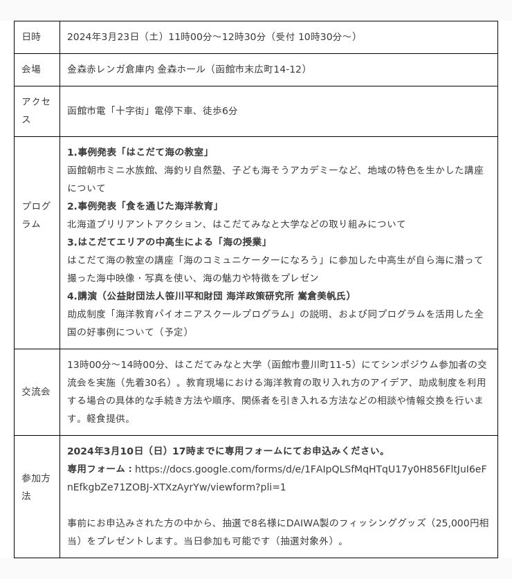 今回のシンポジウムでは、道南地域でのさまざまな海洋教育の実践事例を紹介するほか、海洋教育への助成制度とそれを活用した好事例などを紹介します。このイベントが教育現場に「海についての学び」を取り入れる一助となり、函館・道南に住む子どもたちが地域への愛着を持つと共に、社会課題の解決や自己の生き方を考えるための資質・能力を育むきっかけになることを願っています。海洋教育に関心を持つ教育関係者や自治体関係者の皆さまはもちろん、海と人とのかかわりに関心を持つ方ならどなたでもご参加いただけます。