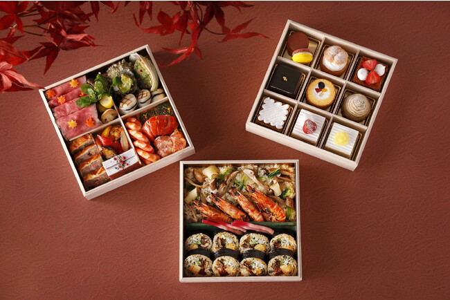 これからの秋の行楽シーズンに特におすすめなのが、ご家族やご友人とピクニックやお祝いごとにぴったりな、彩り豊かな秋の味覚を贅沢に詰め合わせたテイクアウト商品『紅葉重』です。壱の段には、“秋の味覚の王様”「松茸」を贅沢に使用した松茸ごはんや、香ばしく焼いた焼き車海老、弐の段には、秋の茸と栗を添えた佐賀県産黒毛和牛ローストビーフに、パテ・アンクルートや蒸し鮑のジェノバソースなど、贅沢食材を存分に愉しめる一段に仕上げました。さらに、参の段には「パティスリーSATSUKI」の”スーパーシリーズ”をはじめとする大人気スイーツを詰め込んだ9種の口福スイーツをミニサイズでご用意いたします。