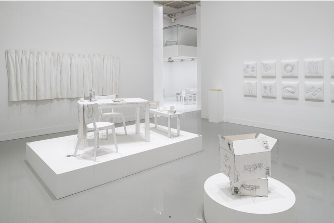 白い布と黒い糸を使った刺繍の平面作品や、家具やカーテンなど実物大の立体作品を組み合わせたインスタレーションで些細な日常に向き合う作品を展開