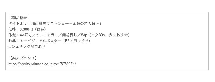 加山雄三スペシャルインタビューをはじめ、歴代バンドの変遷&当事者たちの証言、音楽界約80組の豪華な面々から寄せられたメッセージ、など、ラストショーに至る音楽人・加山雄三の全てをまとめた、永久保存版となる貴重な一冊。キービジュアルポスター(B3/四つ折り)特典付きです。