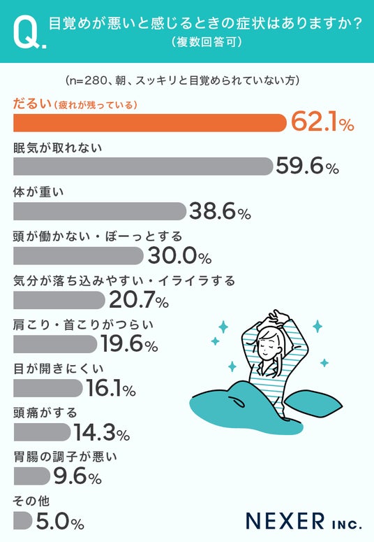 さらに「朝スッキリ目覚められていない」と回答した方に、目覚めが悪いときの症状を聞いてみました。
