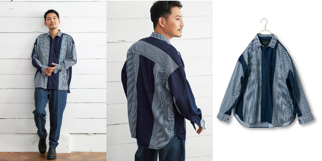 ヒッコリーとデニムをパッチワークしたようなシャツです。太さの違う3種類のストライプと無地のデニムを組み合わせて、大きなマルチストライプにして織り上げています。ゆったりシルエットで、ラフに着られるシャツに仕上がっています。着るほどに色褪せ、こなれた風合いになります。
