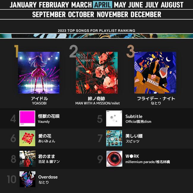 2023年4月度は、TVアニメ『推しの子』オープニングテーマに起用され、コールパートをREAL AKIBA BOYZが担当していることでも話題になっているYOASOBIの「アイドル」が初登場1位を獲得。2位には、MAN WITH A MISSIONがmiletコラボした、TVアニメ『鬼滅の刃』刀鍛冶の里編オープニングデーマの「絆ノ奇跡」がランクインしています。、「Overdose」が今月も10位に入り、ロングヒットを続けているなとりの新曲「フライデー・ナイト」が3位を獲得。その他にも、NHK朝ドラ『らんまん』主題歌のあいみょん「愛の花」が初登場6位、劇場版『名探偵コナン 黒鉄の魚影(サブマリン)』主題歌のスピッツ「美しい鰭」が初登場7位、TVアニメ『地獄楽』オープニングテーマのmillennium parade/椎名林檎「W●RK」が初登場9位と、全6曲が初登場でTOP10にランクイン。ぜひ、この続きはランキング50位までを発表しているプレイリストでお楽しみください。