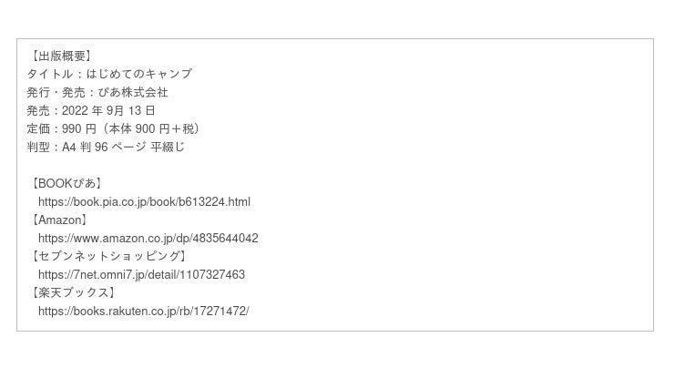 本日9月13日、ぴあ株式会社より、ぴあMOOK『はじめてのキャンプ』が発売となりました。